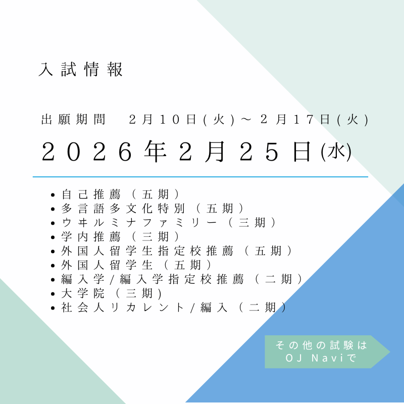 自己推薦(五期)/多言語多文化特別(五期)/ウヰルミナファミリー(三期)/学内推薦(三期)/外国人留学生(五期)/博士前期課程(三期)など