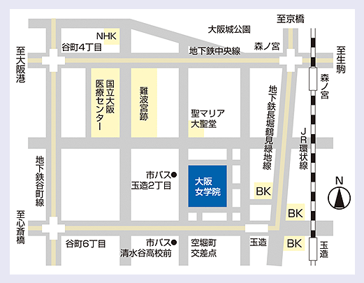 アクセス HOMEアクセス アクセス 学校法人 大阪女学院 〒540-0004 大阪市中央区玉造2丁目26番54号 TEL:06-6761-4013 周辺地図 電車でお越しの方 JR環状線 「玉造」駅下車、西へ500m 空堀町交差点を北へ(徒歩8分) 地下鉄 長堀鶴見緑地線「玉造」駅下車、1番出口を西へ(徒歩3分)、中央線「森ノ宮」駅下車、2番出口を南西へ(徒歩12分) Facebook X Google+ はてブ LINE